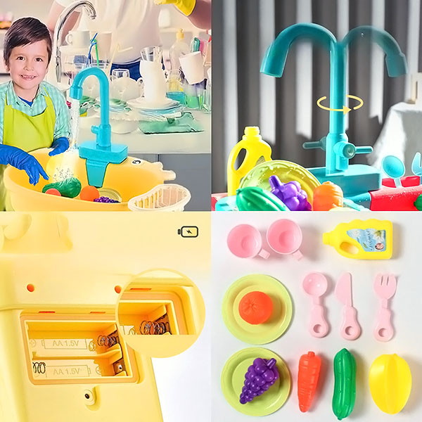 O lava-loiça possui água corrente real, fazendo com que o tempo de brincadeira pareça real. A água corrente dá um toque emocionante, ajudando as crianças a explorar e interagir com o mundo à sua volta através da lente da vida quotidiana.